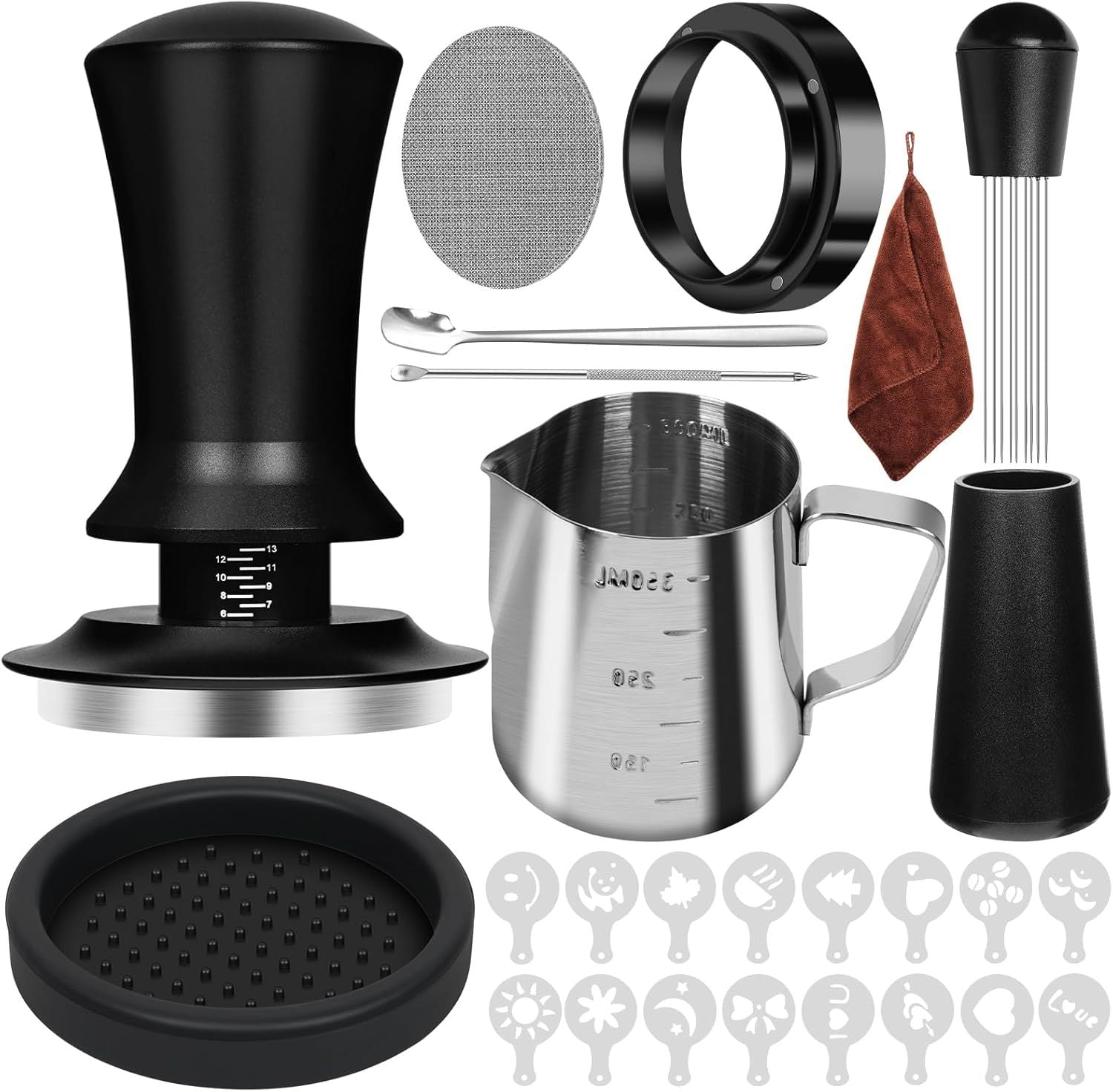 - 【25 Pcs Espresso Tamper Set】- A set of professional barista espresso tools: 1 x 51mm tamper, 1 x 350ml milk jug, 1 x coffee stirrer, 16 x decorative stencils, 1 x dosing funnel ring, 1 x puck screen, 1 x tamper mat, 1 x latte art pen, 1 x stirring spoon and 1 x barista towel. ( The 51 mm tamper fits for 51 mm or larger portafilter. Please measure the dia. of your portafilter before order.)