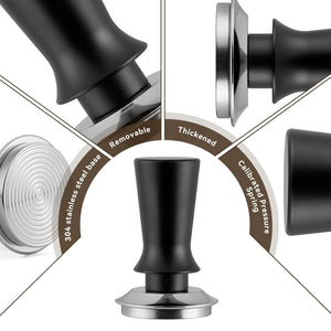 đăPremium Materials and User-friendly DesignăThe tamper set is constructed from food-safe grade 304 stainless steel and other premium materials, renowned for their elasticity and durability. The BVRAIB tamper boasts a calibrated 30lbs pressure, ensuring consistent tamping every time. This results in a uniform compaction experience when making coffee